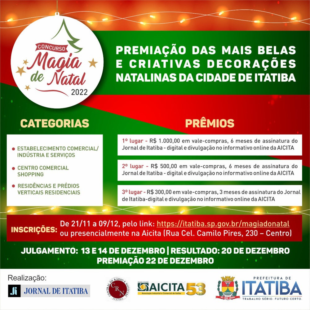 O Concurso Magia de Natal 2022 é uma ação da Associação Industrial e Comercial de Itatiba, em parceria com a Prefeitura do Município de Itatiba e com o Jornal de Itatiba – JI e Rádio CRN, que tem como finalidade exclusiva a escolha e premiação das mais belas e criativas decorações natalinas da cidade de Itatiba.